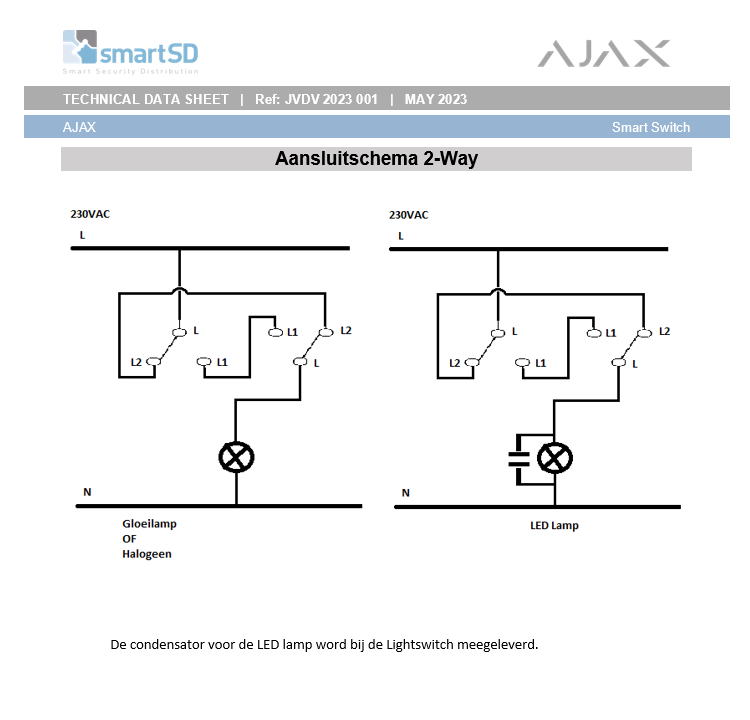 Ajax slimme wissel/hotel lichtschakelaar, Relais voor tweerichtingsschakelaar, drukknop is apart te bestellen. Afmetingen: 76,3×72,3×29,2mm